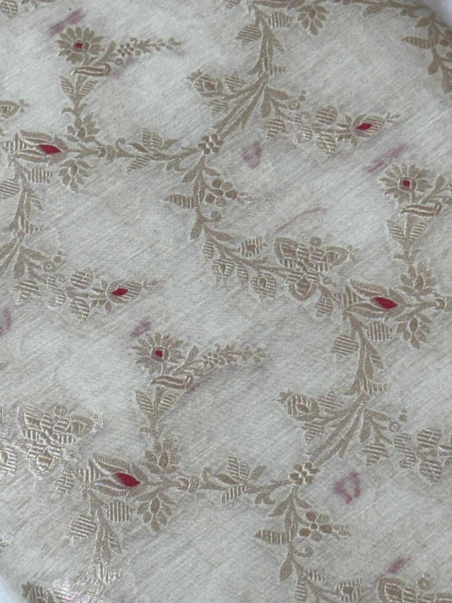 This finely woven handloom cotton fabric features an elegant zari jaal pattern complemented by understated red meenakari details. Made from pure cotton, it provides superior breathability and comfort, embodying a rich traditional charm. Ideal for crafting exquisite garments.