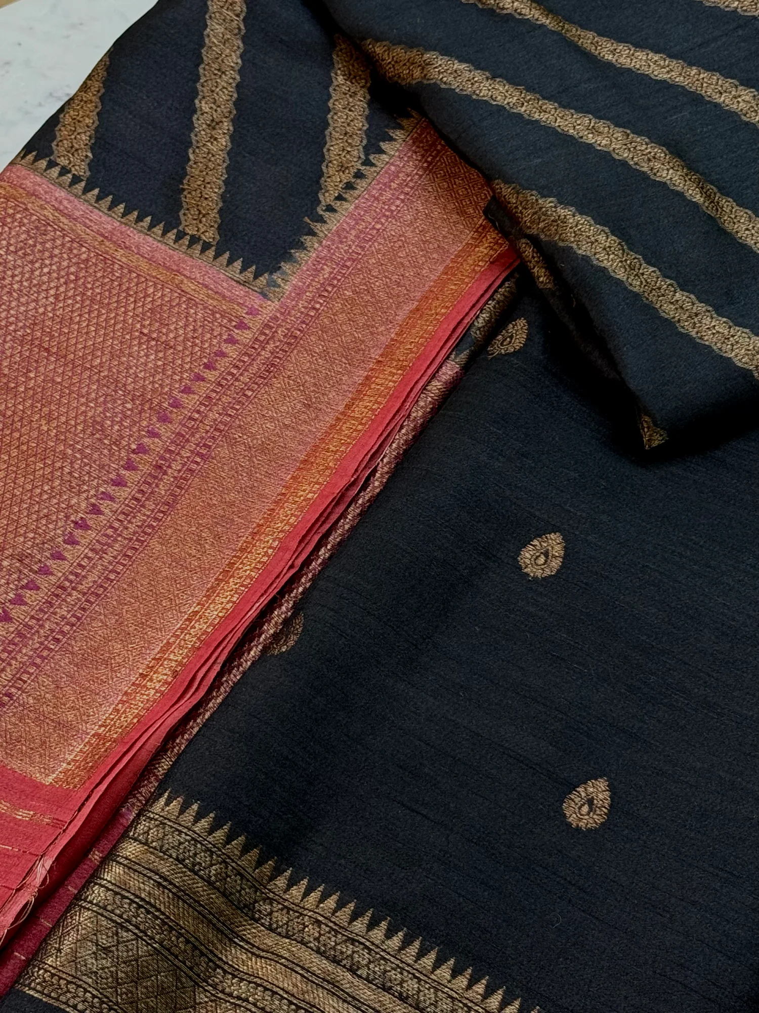 This elegant tussar silk suit features delicate khadua bootas and a beautifully crafted border on the kurta, enhancing its traditional appeal. The dupatta is adorned with a striking red border that adds a vibrant contrast, elevating the overall ensemble. Perfect for those who appreciate refined craftsmanship and timeless style.